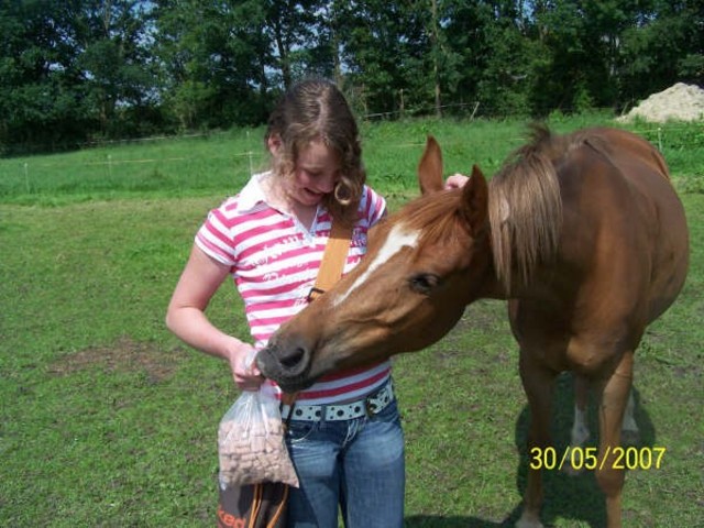 Sasja is erg lief en ook een snoepkont. Ze is erg betrouwbaar en is haast nergens bang voor. Springen vind ze erg leuk. Hard galopperen in en buitenrit vind ze ook leuk. Ze doet geen gekke dingen ze kan wel eens een bokje geven, maar dat doet ze dan omdat ze blij is. Ze bijt niet en trapt niet, je kunt heerlijk met haar knuffelen. Als je met haar gaat wandelen aan het halster touw vindt ze dat super leuk. Stijle bulten op gaan en door water plassen rennen vind ze ook erg leuk. Nu rijd kelsey er op maar later gaat ze op ramira rijden omdat kelsey te groot wordt voor sasja. Kort gezegt het is een super betrouwbare en lieve leuke knuffel/rij pony en heeft een lief koppie. Groetjes Kelsey & Sasja Terug |